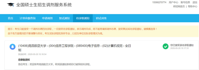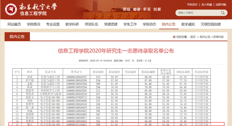 5月19日,南昌航空大学信息工程学院公布了2020年硕士研究生统考招生拟录取名单,taptap16级教育技术学专业学生姚天拟被南昌航空大学信息工程学院电子信息专业录取。