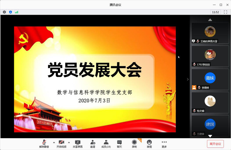 2020年7月3日下午2点,taptap学生党支部在线召开学生党员发展大会。支部全体党员、六名发展对象以及入党介绍人胡作进院长、韩雪、颜无瑕老师一同参加了大会。会议由学生党支部书记李霞妹老师主持。
