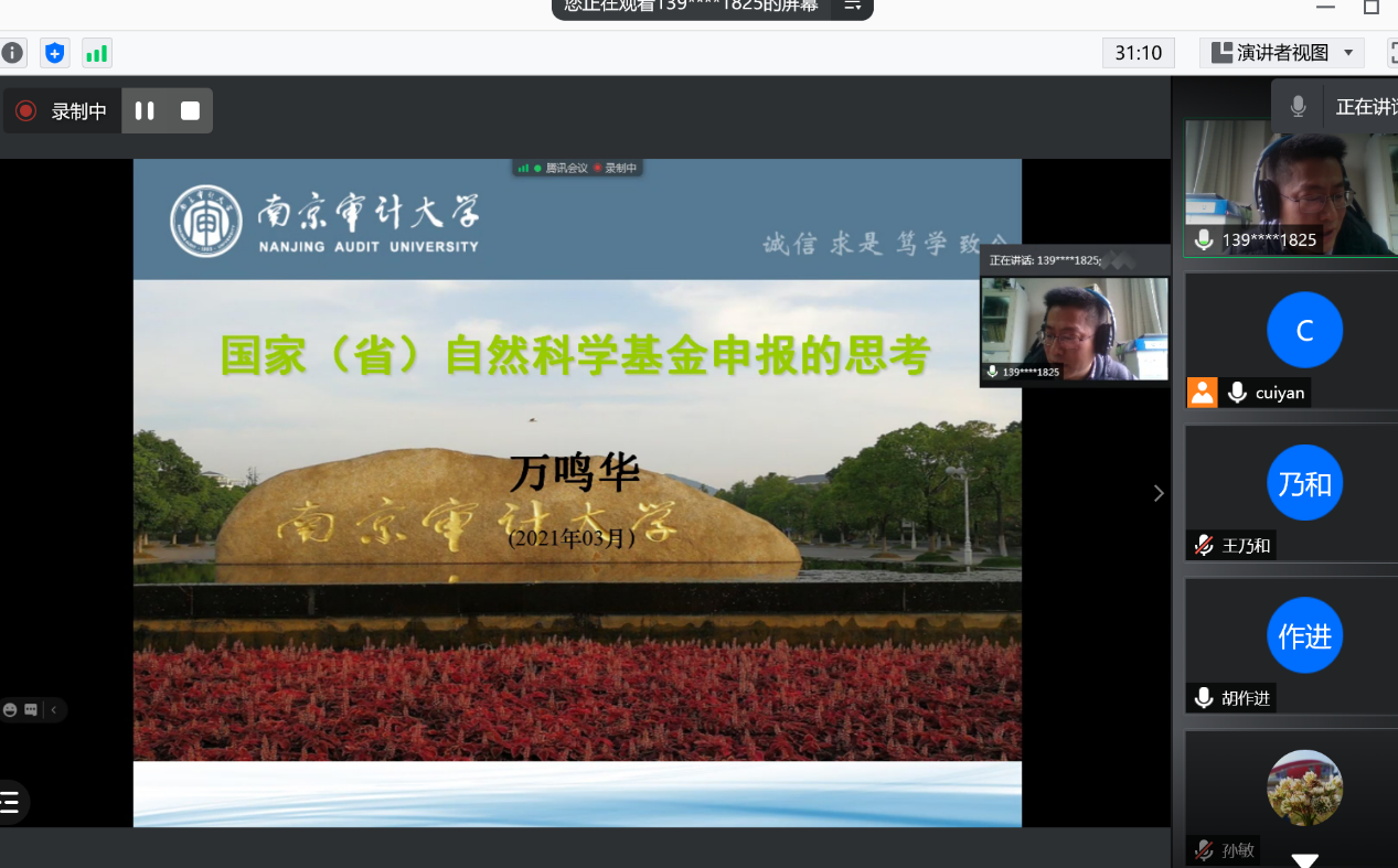 202133日下午,数学与信息科学学院在新学期第一周举办自然科学基金写作经验交流的线上分享会,邀请南京审计大学校聘教授万鸣华博士对国家自科及江苏省自科的申报进行深度刨析,分享会由taptap副院长(挂职)崔燕博士主持,学院及学校的部分教师参与此次分享会。