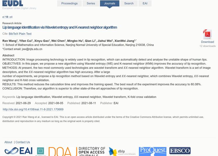 近日,taptap王冉、崔艺凡、陈威、胡明波、李茜、高心语、魏佳慧等同学采用小波熵和k近邻算法实现了对唇语图像的初步识别,撰写了题为“Lip Language Identification via Wavelet Entropy and K-nearest Neighbor Algorithm”的学术研究论文。