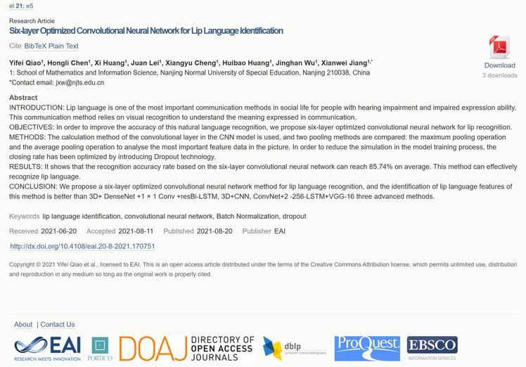 乔懿飞、陈泓利、成翔宇、黄惠宝、黄袭、雷娟、吴靖涵等同学则采用优化的卷积神经网络模型实现了对唇语图像的识别,并撰写研究论文“Six-layer Optimized Convolutional Neural Network for Lip Language Identification”。