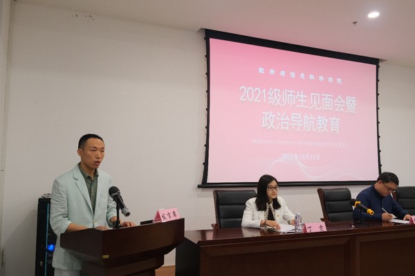 为增进师生的相互了解,帮助和引导新生更好地融入大学生活。10月15日下午,数学与信息科学学院于实训大楼301举行师生见面会暨政治导航教育。院党总支书记李宏伟、院长胡作进、院党总支副书记丁雯出席会议,数信院全体辅导员、教师代表、学生会代表以及2021级新生代表现场参会,其余新生因疫情防控要求,线上直播观看。本次会议由新生辅导员张国盛老师主持。