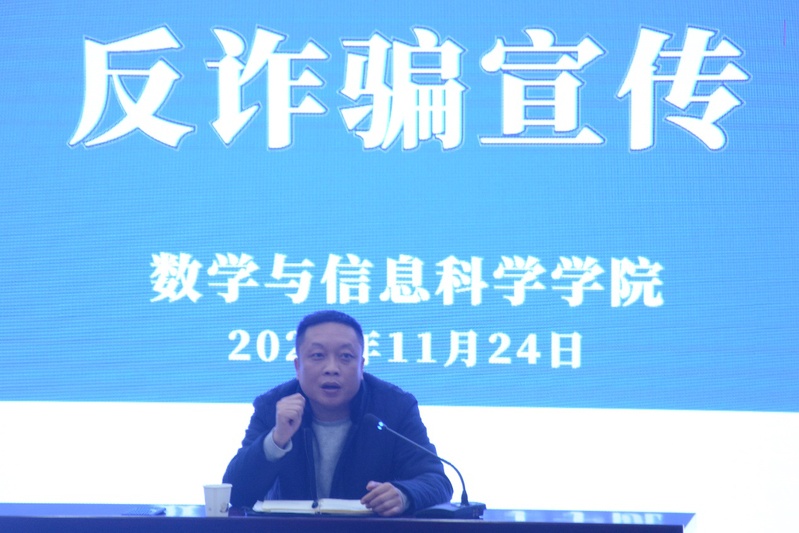 为进一步提高大学生安全防范意识,杜绝校园诈骗情况发生,11月24日下午,数学与信息科学学院在博远楼106智慧教室召开安全知识系列讲座之反诈骗宣传。本次讲座特邀南京市栖霞区燕子矶派出所姚雪垠警官主讲,学院党总支副书记丁雯、21级辅导员张国盛以及部分21级学生现场共同聆听,讲座由张国盛老师主持。