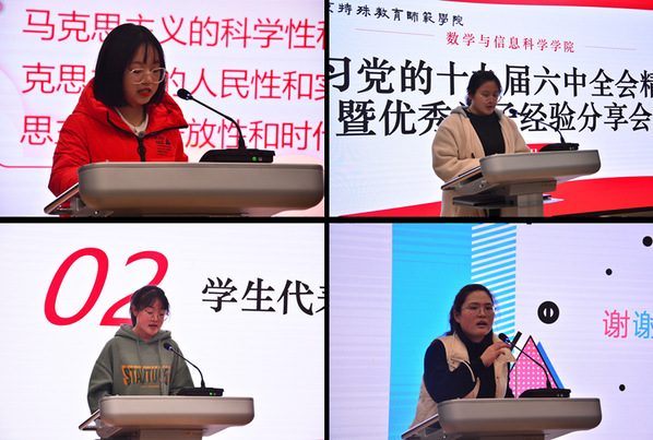 学生党员王苏徽带领大家学习了党的十九届六中全会精神,在深入学习党的百年奋斗重大成就和历史经验的同时,结合自身实际,表示要以更高的标准严格要求自己,坚定理想信念,扎实学好知识,为实现第二个百年奋斗目标、实现中华民族伟大复兴的中国梦而不懈奋斗。学生代表袁首博、牛丽萍从新生角度出发,就学习内容进行了交流发言。