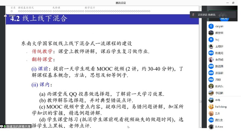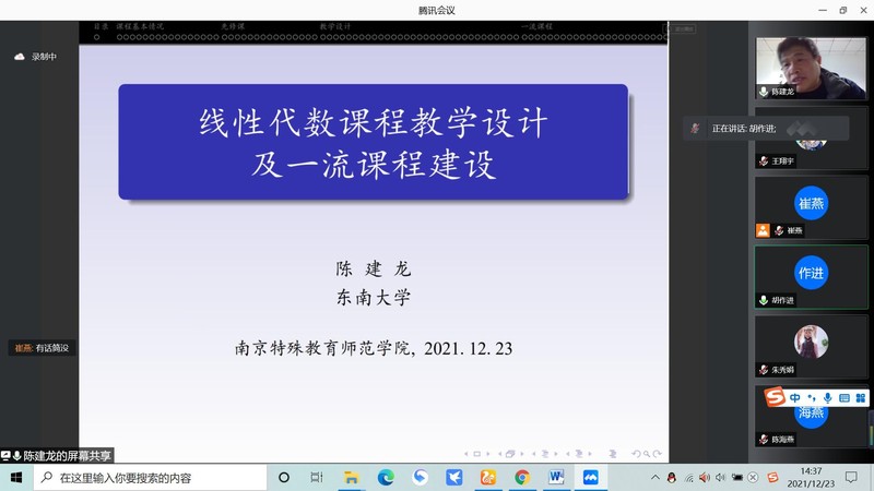 2021年12月23日下午2:30,数学与信息科学学院举办一流课程建设经验线上分享会,报告邀请东南大学的陈建龙教授,胡作进院长主持分享会,院系领导及部分专任教师参与分享会。