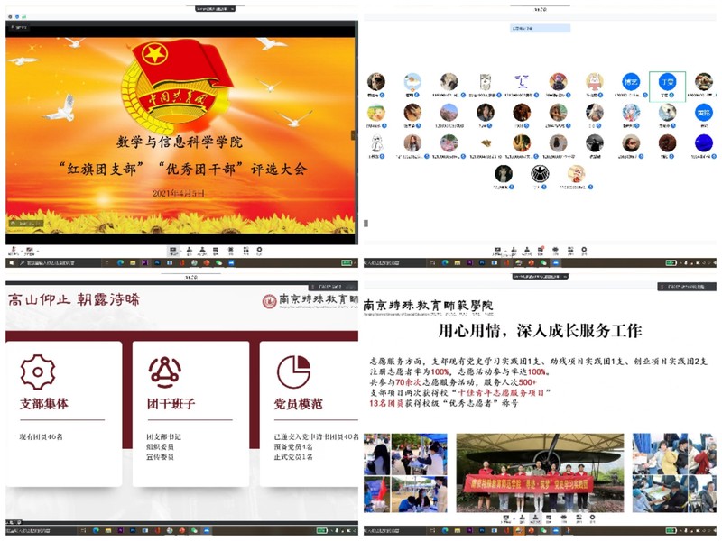为深入贯彻落实党的十九届六中全会精神,切实提升学院团支部活力,4月10日,数学与信息科学学院团总支召开“红旗团支部”线上评选汇报会议。会议由数学与信息科学学院辅导员李唐萌老师主持,学院党总支副书记丁雯老师以及全体辅导员组成本次“红旗团支部”评选小组。