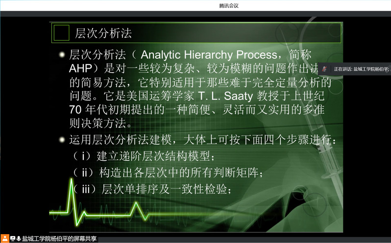 2022年2月14日晚,数学与信息科学学院邀请了盐城工学院的杨伯平教授教授开展学术讲座。讲座题目是“评估模型精讲”,数信学院即将参加美国大学生数学建模竞赛的学生及数学教研室和计算机教研室的相关老师参加了讲座。