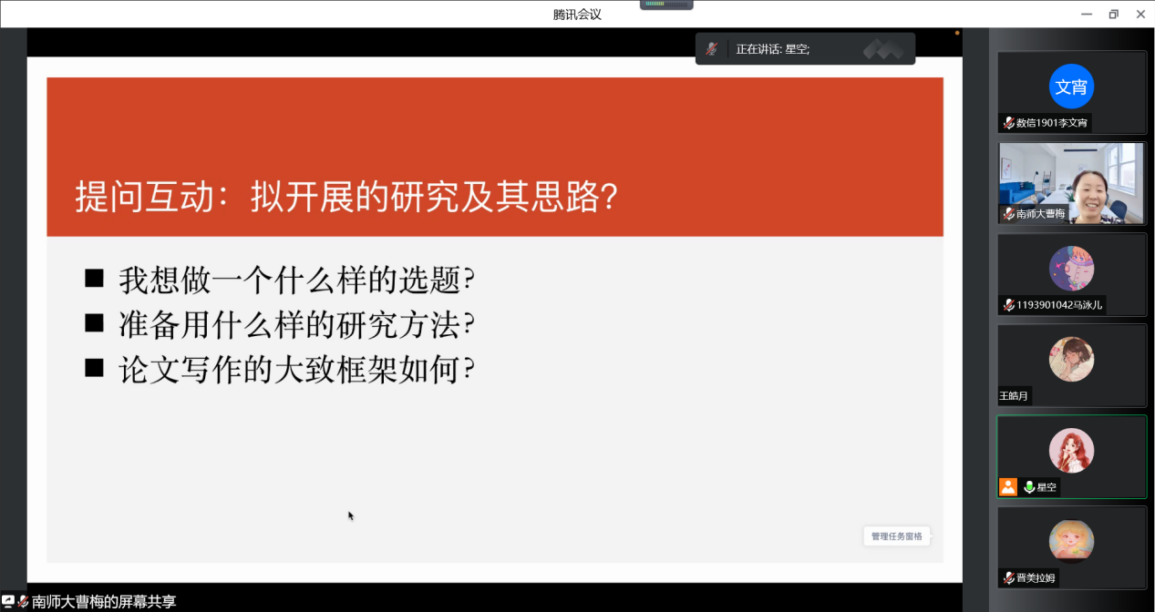 最后,曹教授与同学们进行互动与讨论。结合同学们的毕业论文题目,给出了题目修改建议。曹教授提醒同学们注意:论文题目要明确研究目标;研究范围适中,切忌过大;研究对象不要局限于学生;选择合适的教学模式等。