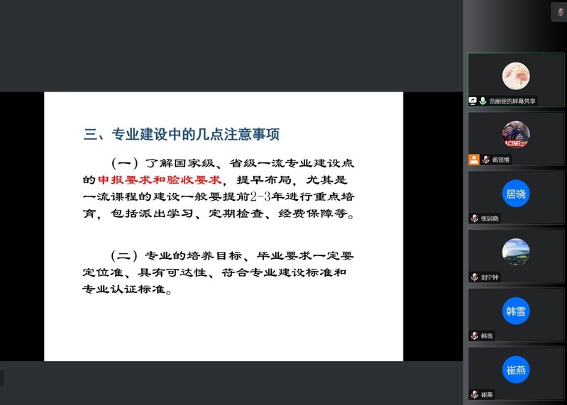 专家们首先肯定了学院近年来的发展和取得的成绩,尤其在优秀人才引进和科研成果方面的进步给人印象深刻。专家指出专业建设要有长远规划和顶层设计,结合taptap具体情况要找准特色定位和影响力辐射,同时要注重政策层面的引导和激励。专家还指出要关注行业特色,结合相关领域,发挥团队作用,做有组织的教科研,充分调动教师个体的积极性。专家们还就专业建设过程的注意事项给出了详细指导。他们指出:要清楚了解省级一流专业建设点的申报要求和验收要求,提早布局,尤其是一流课程的建设一般要提前2-3年进行重点培育;课程目标如何达成、达成度如何计算、未达成的原因、如何进行改进等要有明确的计算方法和说明;省部校级文件的收集学习与讲解、专业建设材料的收集与整理、申报书验收报告的撰写等工作都要有专人负责,且有若干个团队协同工作;课程和教材要注意校内辐射和校外推广;建设成果不仅是教师的成果,更要重视学生的成果和获奖;要构建完整的教学质量保障体系和常态化监控机制。