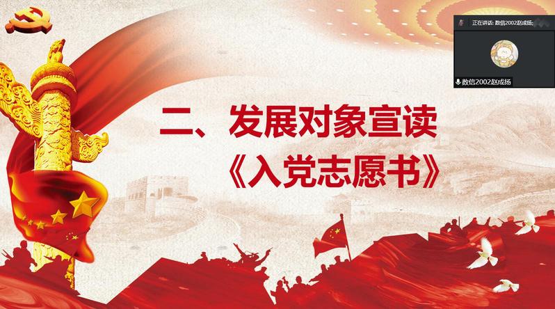 为做好党员发展工作,进一步健全和完善支部组织建设,2022年12月30日,数信与信息科学学院学生党支部在腾讯会议召开2022年下半年党员发展大会。数学与信息科学学院学生党支部全体成员参加此会议,会议由支部组织委员丁力主持。