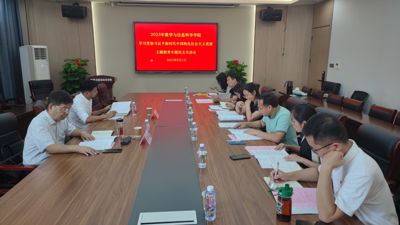 2023年9月1日下午,数学与信息科学学院在博雅楼3601会议室召开学习贯彻习近平新时代中国特色社会主义思想主题教育专题民主生活会。校党委常委、副校长华兴夏,校监督检查处处长李志军到会督导。数学与信息科学学院全体党总支委员、副处级以上领导干部参加会议。会议由党总支书记李贵希主持。