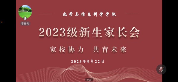 为了更好搭建家校协同育人平台,完善家校沟通机制,提升高校育人质量,922日,数学与信息科学学院召开主题为“家校协力,共育未来”的2023级新生家长会,数学与信息科学学院党总支书记李贵希、数学与信息科学学院院长王兵、数学与信息科学学院党总支副书记丁雯出席和213名学生家长云端会面。
