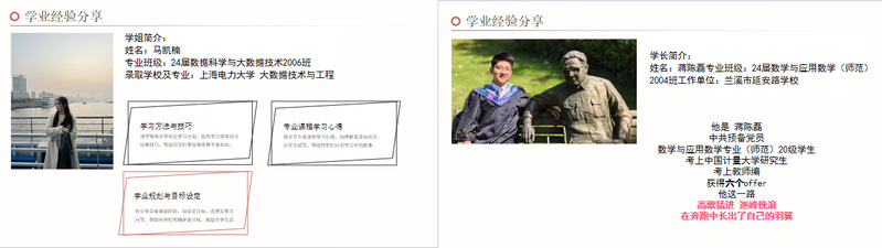 在学长学姐交流分享环节,邀请到了学院数据科学与大数据技术2006班现就读于上海电力大学大数据技术与工程的研究生马凯楠和学院数学与应用数学(师范)2004班现工作于兰溪市延安路学校的蒋陈磊通过腾讯会议分享考研、考编经验。他们毫无保留地分享学习方法、规划思路,从院校专业选择、复习计划制定、备考心态调整等方面进行了详细讲解。他们建议大家要尽早确定目标院校,并针对性地收集历年真题和复习资料,进行系统性的复习。除了学习方法,学长学姐们还分享了他们在备考过程中遇到的困难和挑战,以及如何克服焦虑、保持积极心态的经验。学姐、学长的分享为有考研意向的同学指明方向,也为其他同学的学习成长提供了良好的经验。
