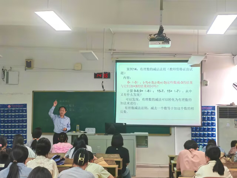 刘耀斌教授以其丰富的实战经验和专业视角,为同学们带来了一场极具针对性的备考指导。刘耀斌教授结合自身多年参与教资面试的经历,强调了面试环节对师范生职业素养的综合考查。他指出,教师资格面试不仅是知识储备的检验,更是教学基本功、临场应变能力与教师职业风范的全面展示。他重点围绕“教学基本功考查”这一核心,从教材研究能力、教学思路设计能力、教学技能三方面展开详细讲解。在教材研究能力方面,他以数学教材中“有理数减法法则”的教学为例,现场板书推导过程,阐释具体算式,引导学生归纳规律,强调在教学中渗透归纳思想与符号意识的重要性;在教学思路设计上,他结合“上课铃声响后黑板出现学生绘制的漫画并署名”这一真实场景,指导学生如何以幽默语言化解课堂突发情况,进而自然引入教学主题,同时现场演示了如何通过“问题链”设计分层提问、小组合作探究等互动环节,实现教学层次清晰化与时间分配合理化;针对教学技能,他拆解了板书设计的评分细节,强调尺规作图的规范性、徒手绘图的对称性以及主板书与副板书的分区逻辑,让同学们对“板书即教学思维可视化”的理念有了直观认知。