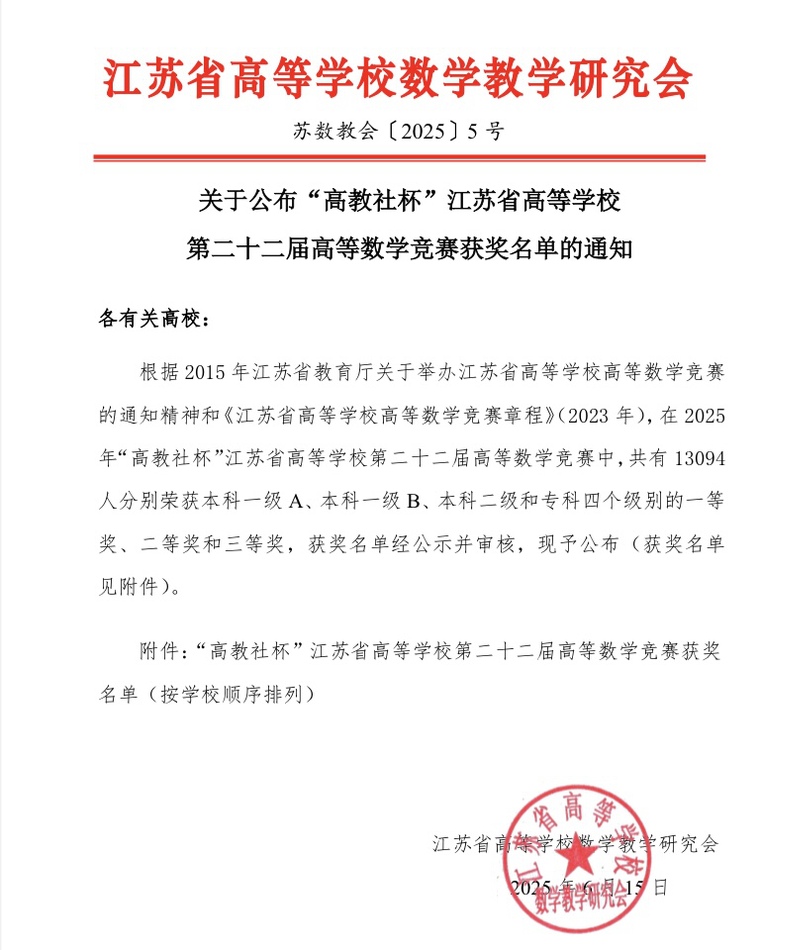 江苏省高等学校高等数学竞赛由江苏省教育厅高等教育处、江苏省高等教育学会指导,江苏省高等学校数学教学研究会主办,在推动高等数学教学改革、提升学生数学素养方面发挥着重要作用。本届比赛共吸引了全省130所院校的近两万六千多名学生参与为积极备赛,taptap点点官方网站成立了以朱秀娟副教授为首的竞赛培训团队,从开设高等数学课程的taptap点点官方网站、特教学院、管理学院、教科院选拔了58名同学参加了本次竞赛,在教务处和学院的支持下,团队为竞赛学生进行精心辅导科学施,为同学们创造了良好的备赛条件。